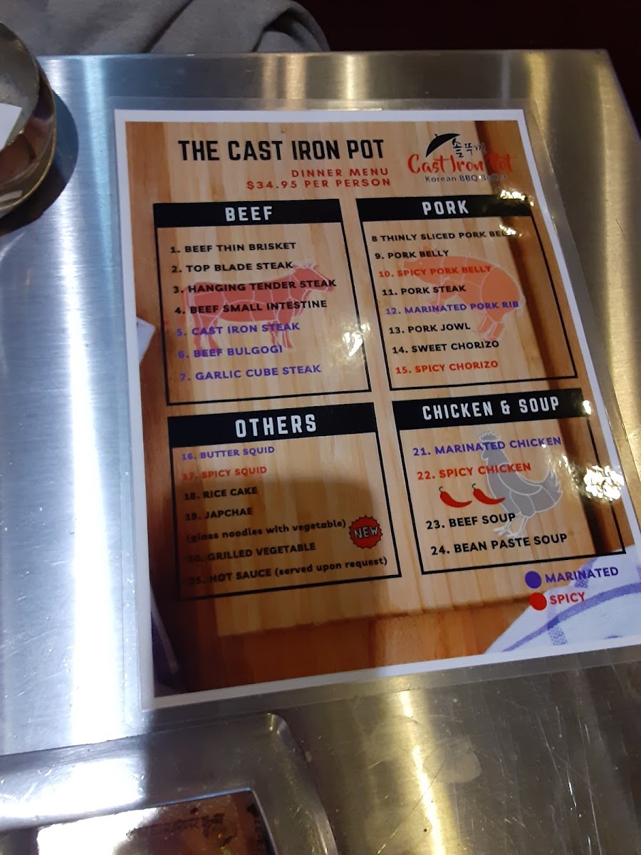 Spicy. Regular size - spicy pork belly served with rice, kimchi and special soy sauce with chayote, jalapeno combo menu - spicy pork belly served with rice and beef soup, 2 fried dumplings, cabbage salad, kimchi, special soy sauce with chayote and jalapeno.