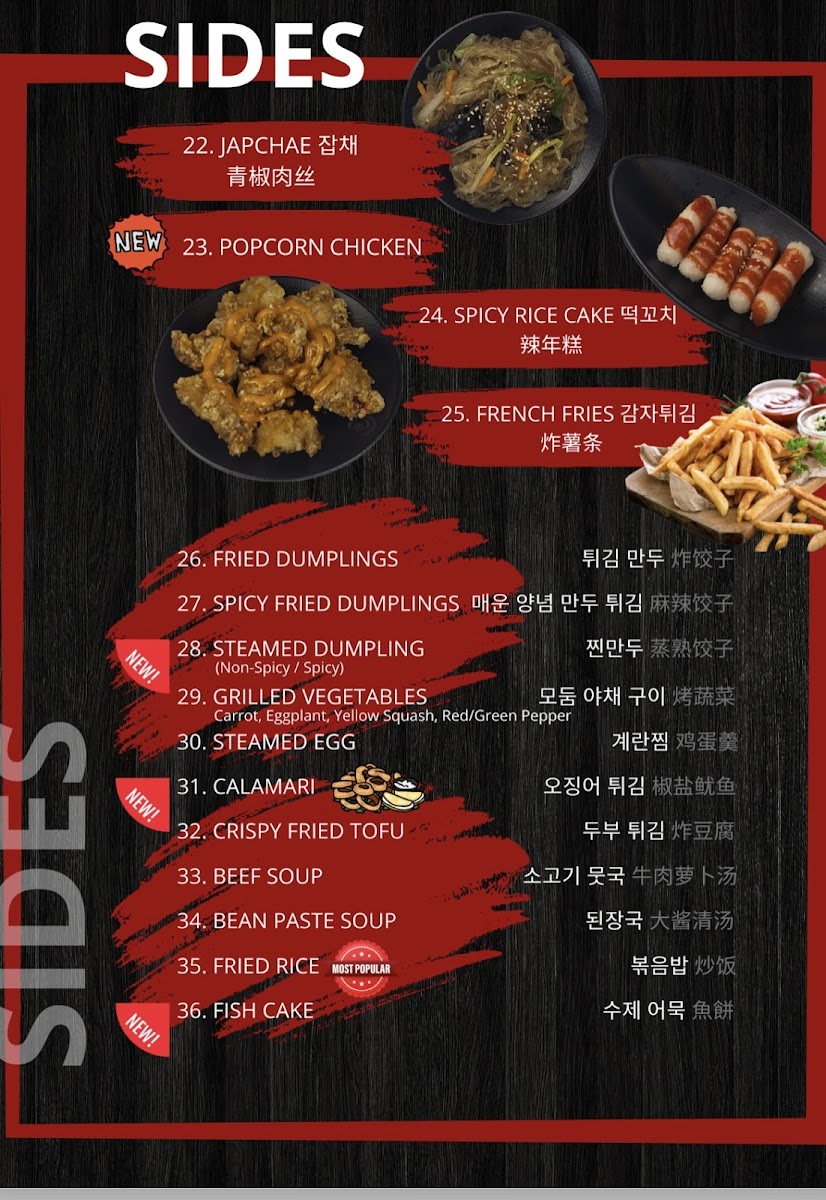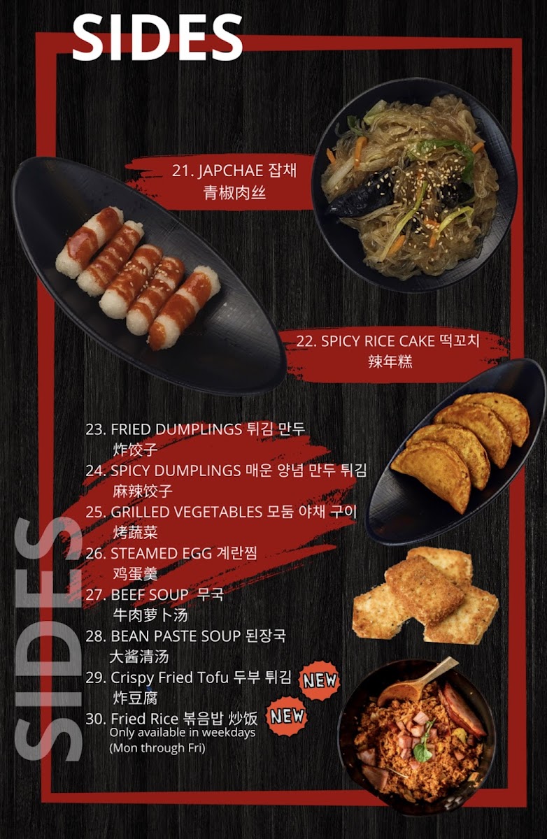 Regular size - chicken served with rice, kimchi and special soy sauce with chayote, jalapeno combo menu - chicken served with rice and beef soup, 2 fried dumplings, cabbage salad, kimchi, special soy sauce with chayote and jalapeno.